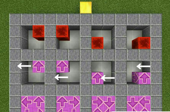 如圖,就以最簡(jiǎn)單的箭頭圖案方塊為例,金塊的位置是你擺放第一個(gè)方塊時(shí)面朝的方向,紅石塊是你擺放第一個(gè)方塊的位置,箭頭所在的位置是下一個(gè)方塊所擺放的位置,箭頭的指向是擺放下一個(gè)方塊時(shí)玩家所朝的方向,順時(shí)針和逆時(shí)針擺放可以擺出更多的圖案,以此類推。